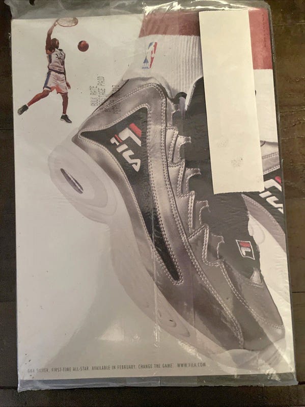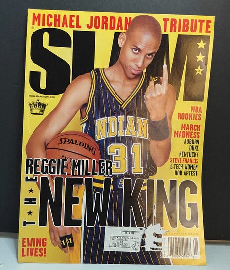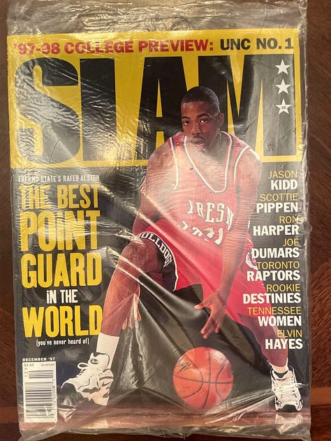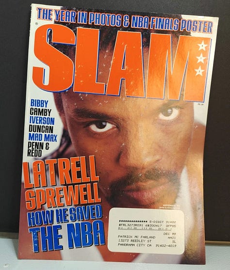 During the Harris era, both subscription copies we’ve seen were bagged (including #22 Rafer Alston), while Petersen-era subscriptions through #35 (August 1999) used glued paper address labels. The first white-box, barcode-free subscription copy we’ve found is issue #36 (September 1999).