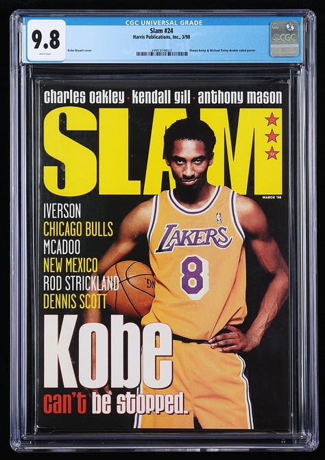 On June 25, 2025, one collector paid more than $700 for the only copy of Kobe Bryant’s first solo SLAM cover to achieve an elusive 9.8 grade from Certified Guaranty Company (CGC). Published more than 25 years ago, the square-spined issue is covered in deep black and bright yellow ink, somehow journeying from a newsstand in March 1998 into a CGC slab in 2023 without acquiring any scratches, bends, or scuffs along the way. Pieces like that don’t come around very often, and any SLAM collector or Kobe fan would be proud to own it.