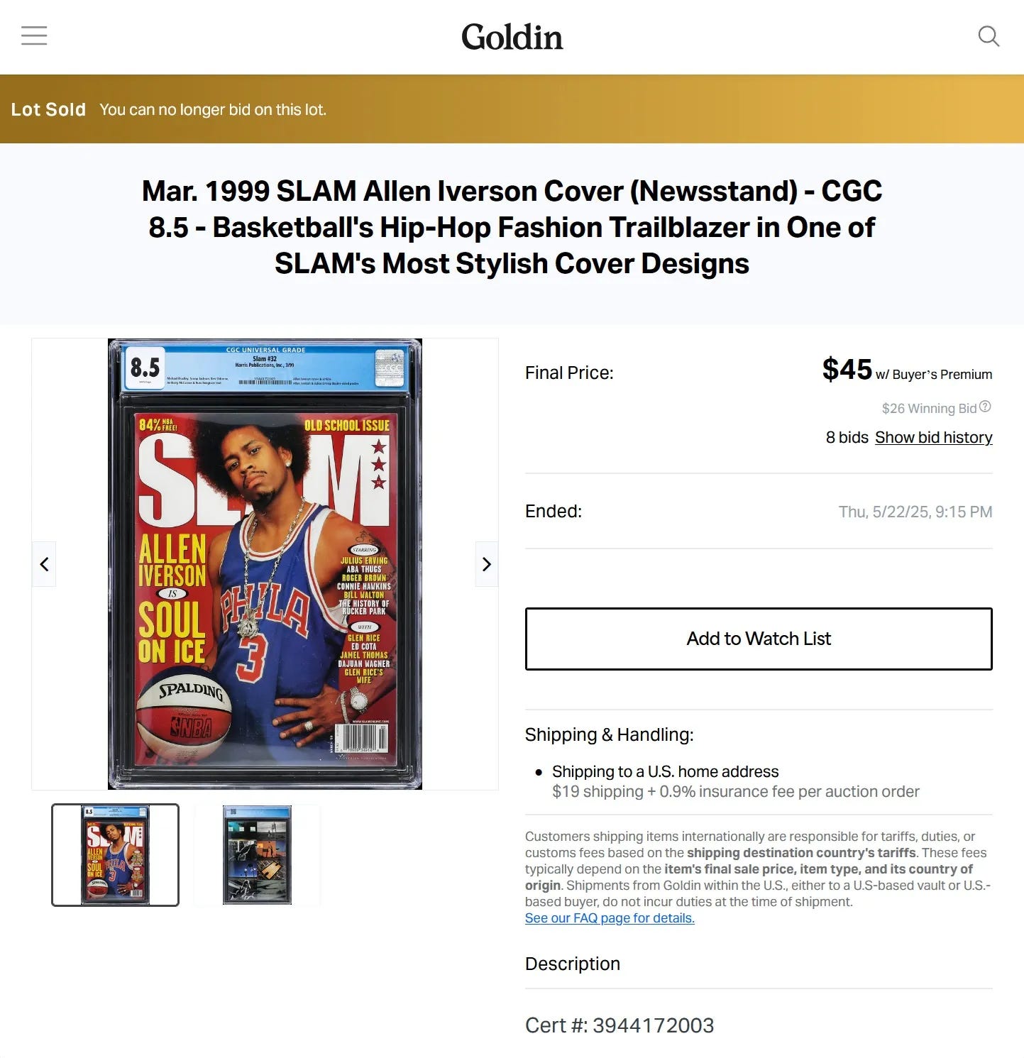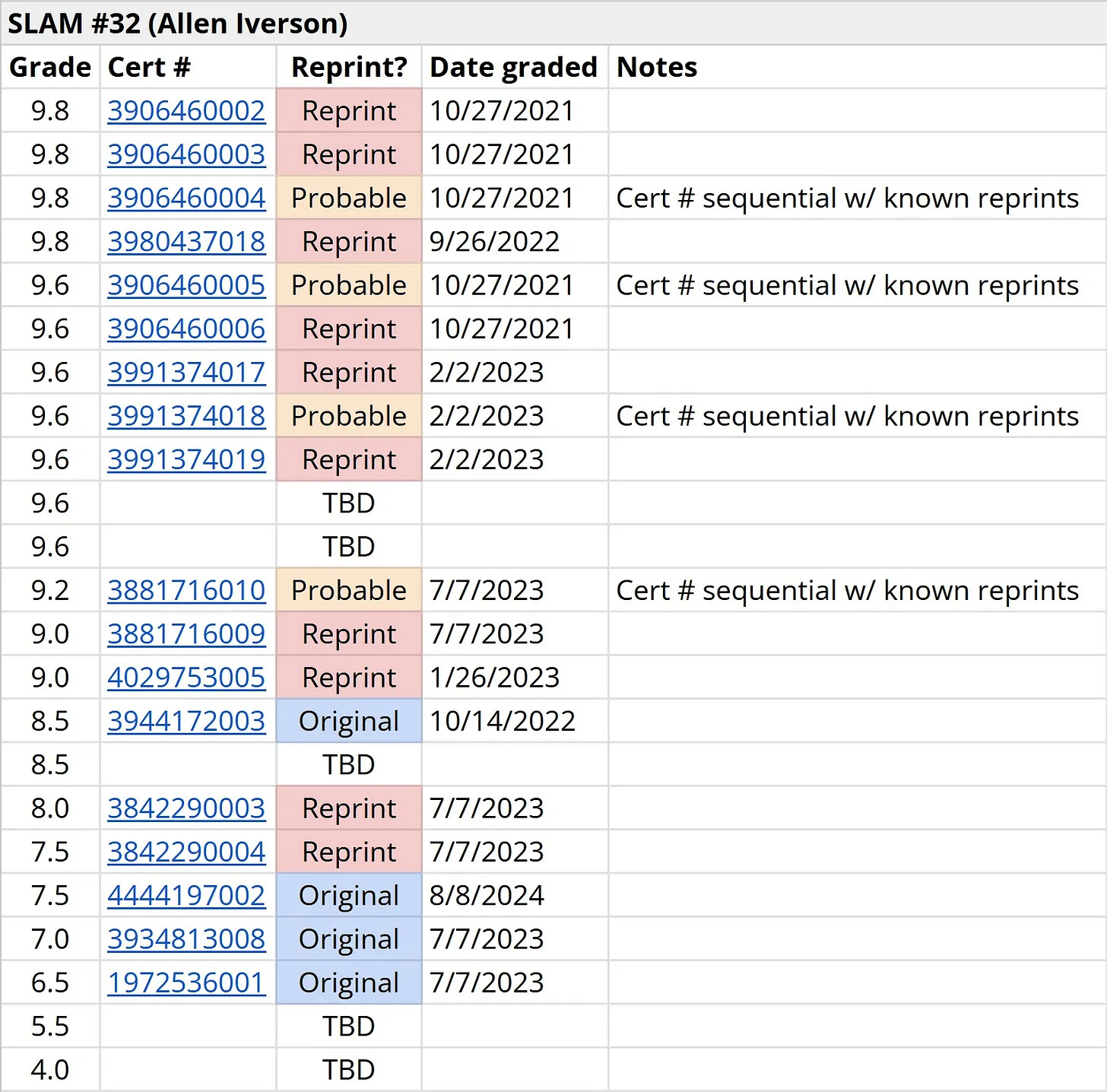 Using auction results tools such as WorthPoint, PicClick, and eBay’s Product Research (as well as searching on Google Images and Instagram) we’ve identified 20 SLAM Rewind editions certified by CGC as originals, with eight others very likely to be reprints based on their certification numbers.