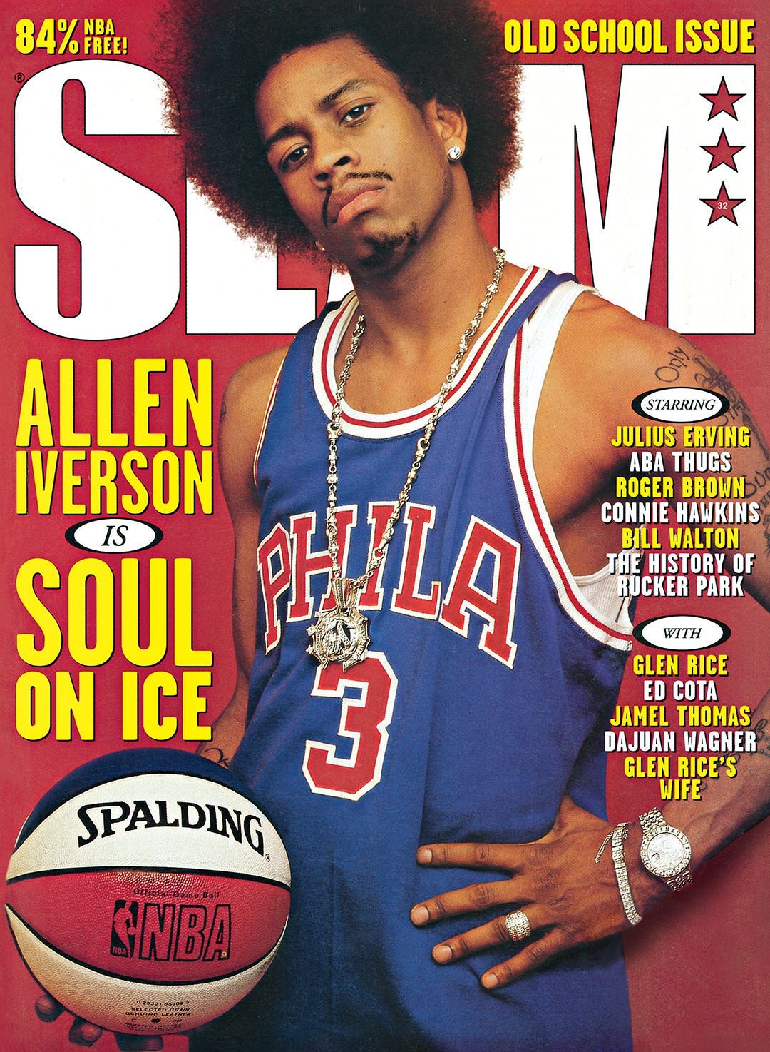 In November 2020, SLAM announced the first installment of their Rewind Series, beginning with the cover that most epitomized the mag’s young, independent, and in-your-face attitude: The March 1999 edition featuring Allen Iverson with his hair out, wearing a throwback 76ers jersey, draped in diamonds, and holding an ABA-styled Spalding during the NBA lockout. It is arguably the most memorable SLAM cover ever, and it remains in high demand for collectors to this day.