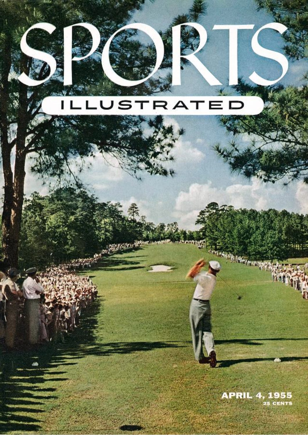 peoplefanspatrons line the 8th hole at Augusta National in 1954 — the year before this issue was published — all peering toward defending champion Ben Hogan during a playoff with eventual champion Sam Snead. Though this cover doesn’t feature a tournament champion, captures the beauty of the Masters like few others have.