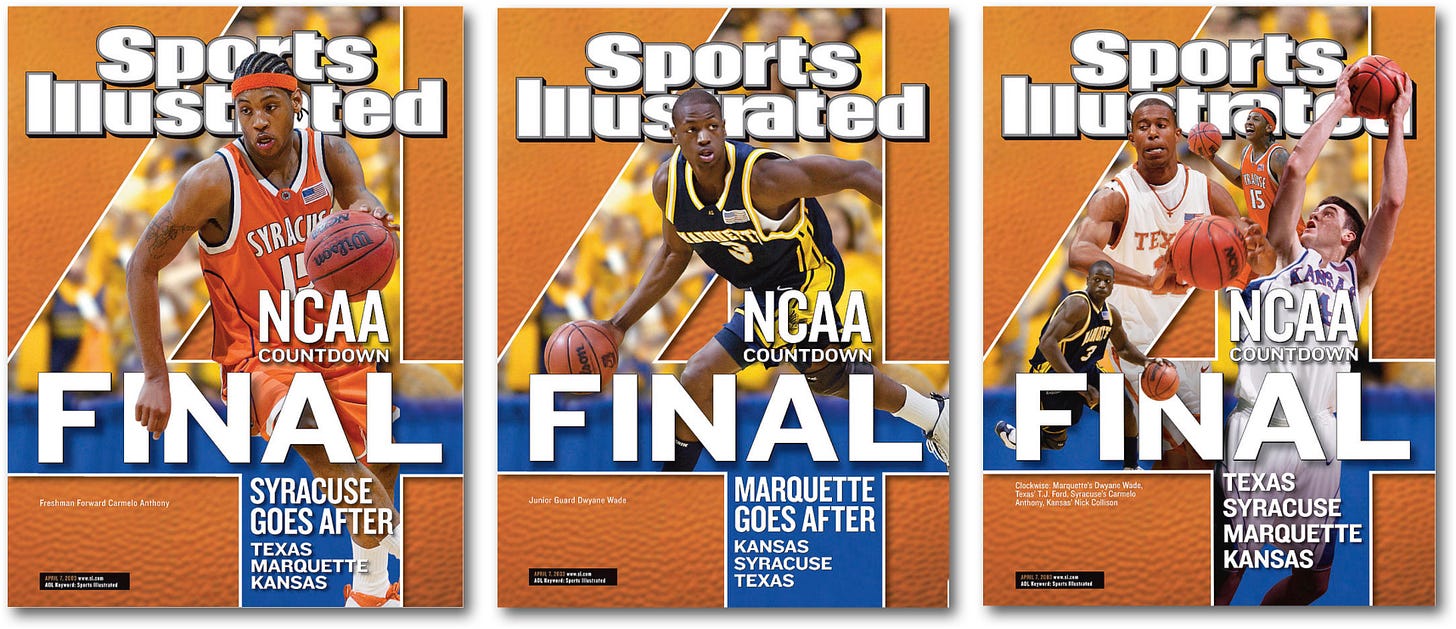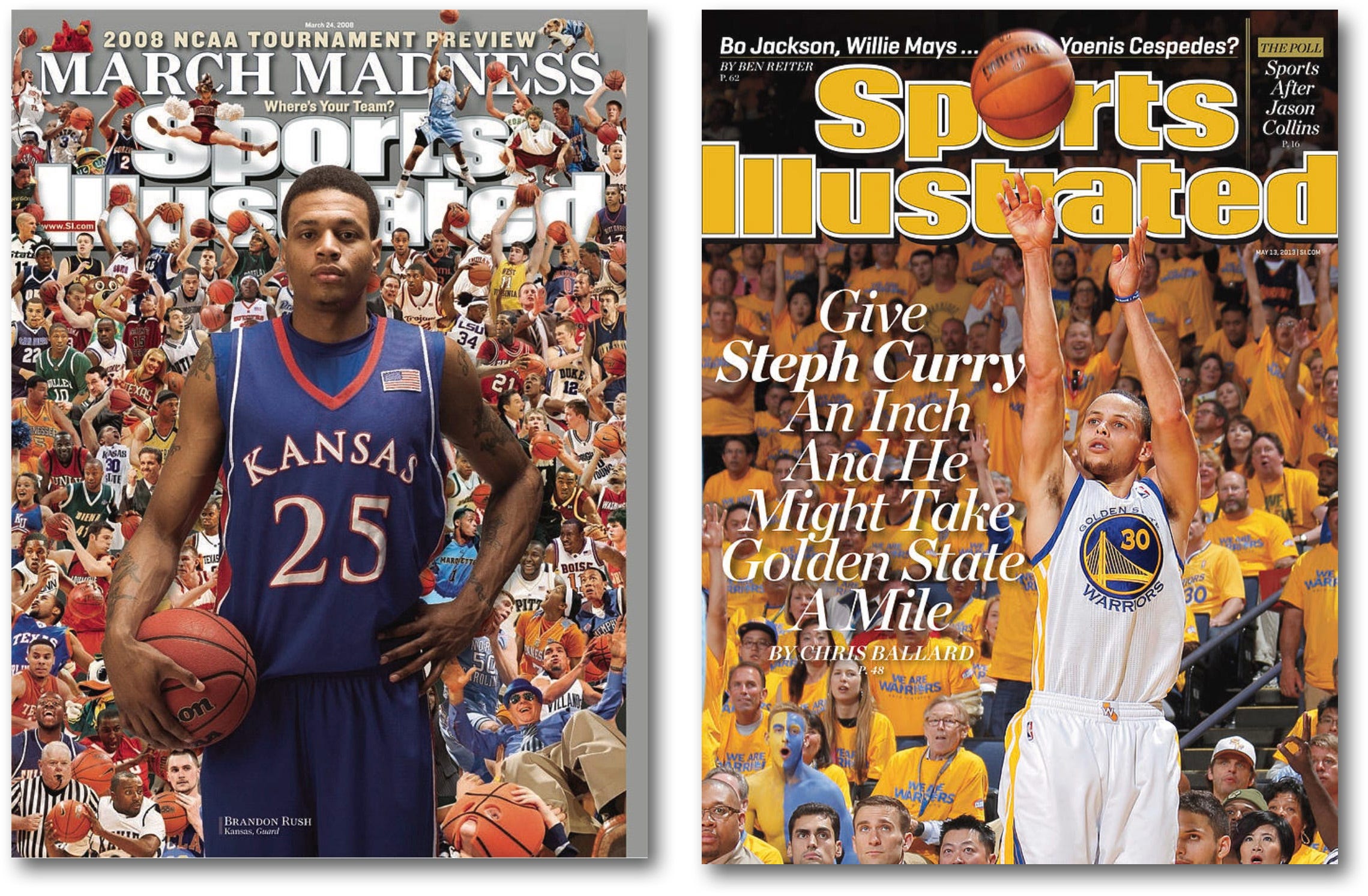 In some cases where the athlete in question appears in an inset or is otherwise not the main focus of the cover, a subsequent cover may be deemed by collectors as the athlete’s “first”. An extreme example of this is Stephen Curry’s appearance in the top right hand corner of Sports Illustrated’s 2008 March Madness preview collage. The May 13th, 2013 issue is considered by collectors as his first SI cover.