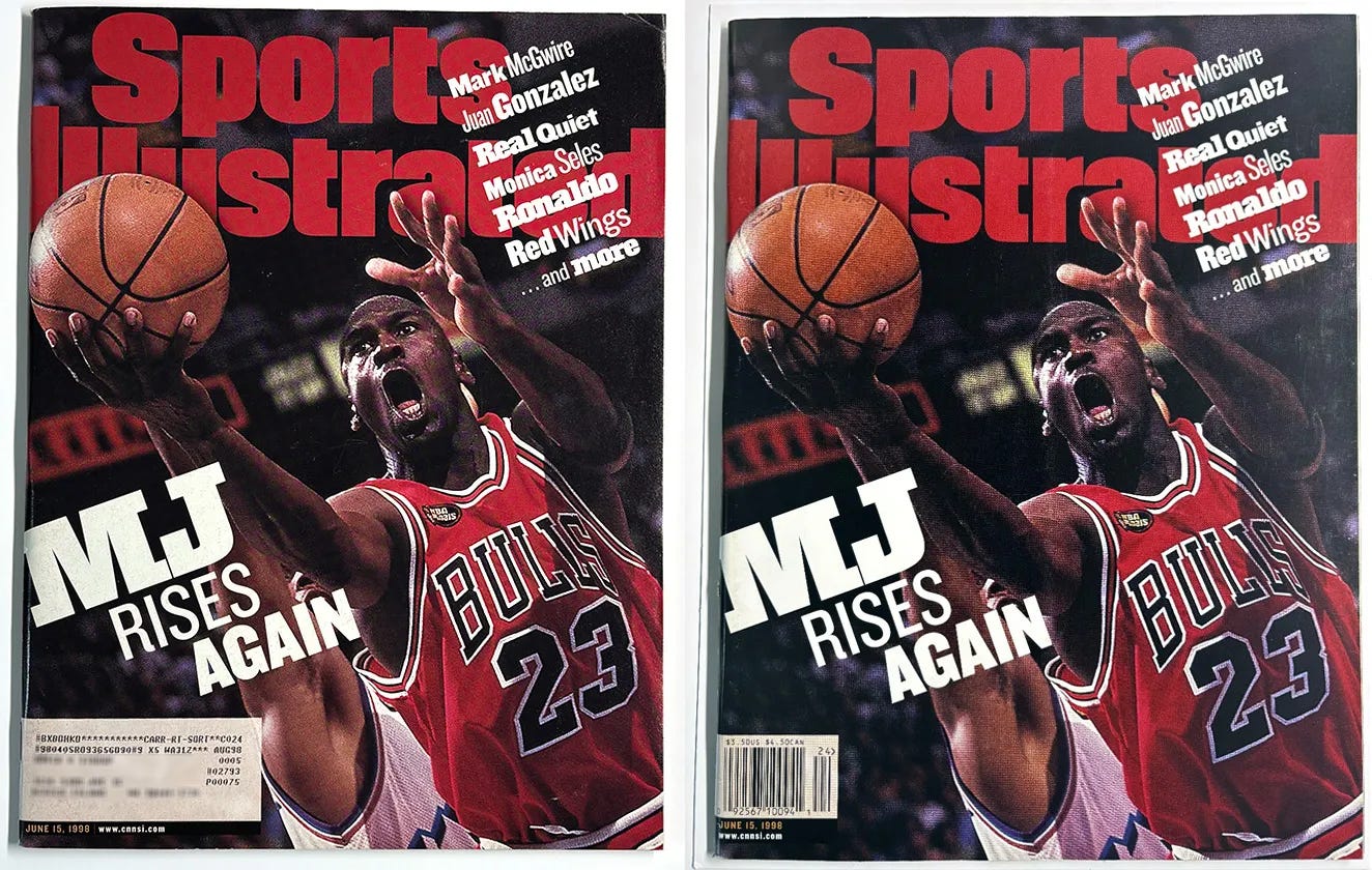 In the mid-1990s, Sports Illustrated shifted from paper subscription labels affixed with adhesive to addresses printed in white boxes directly on the covers.