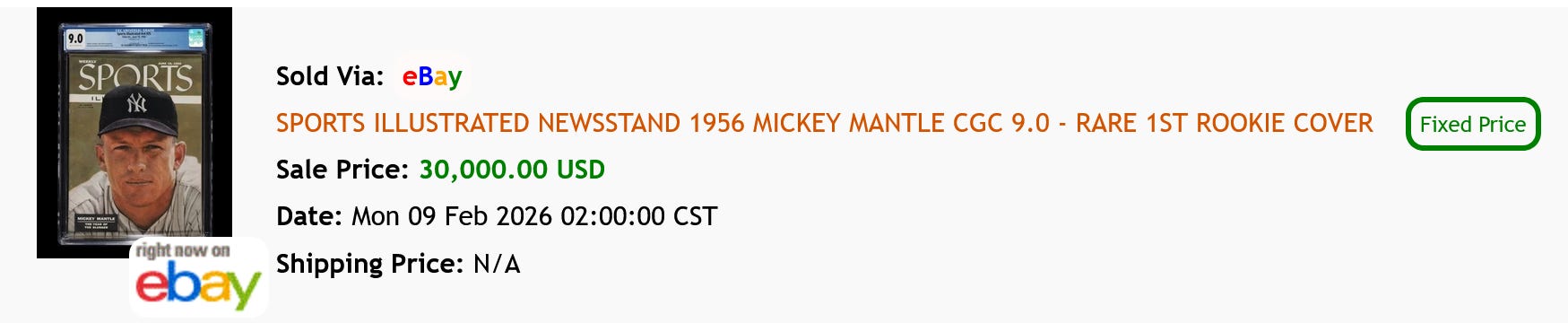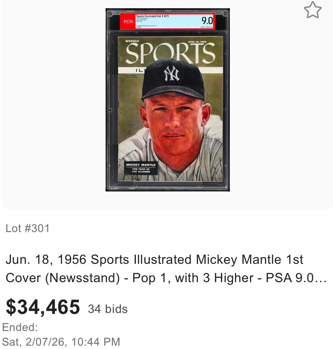 In a highly anticipated auction (for those who pay attention to such things), a PSA 9.0 copy of Mickey Mantle’s first Sports Illustrated cover closed at nearly $35,000 last Saturday.